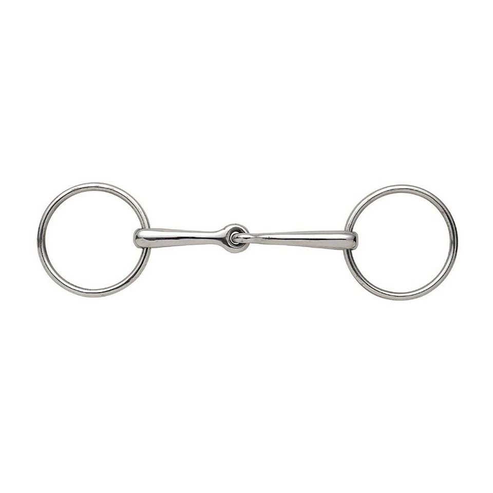 The single joint allows for more pressure to be placed on the side of the mouth when the rein is used whilst the loose rings provide more movement while helping to discourage any leaning or fixing of the mouth.